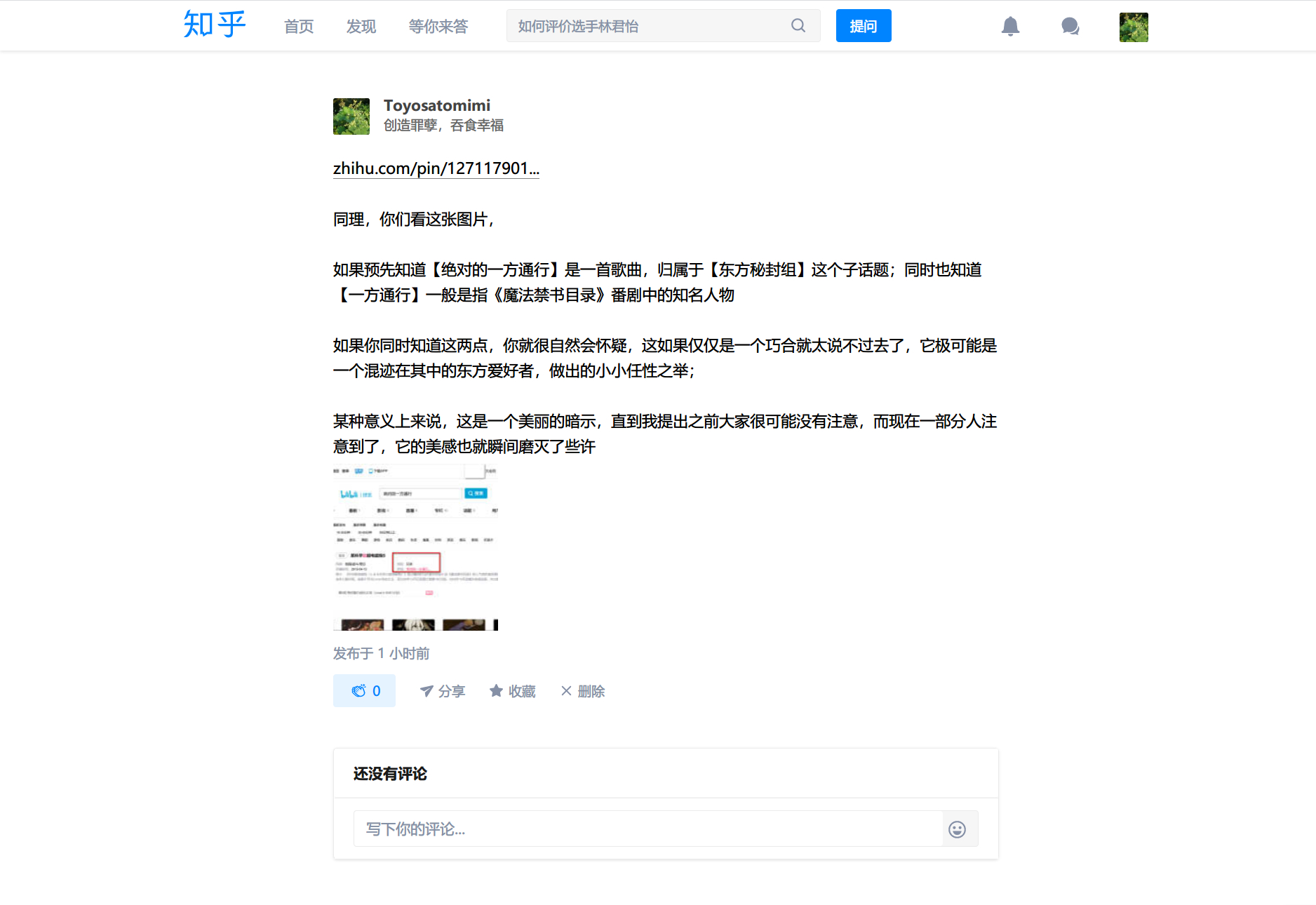 如果预先知道【绝对的一方通行】是一首歌曲,归属于【东方秘封组】这个子话题;同时也知道【一方通行】一般是指《魔法禁书目录》番剧中的知名人物