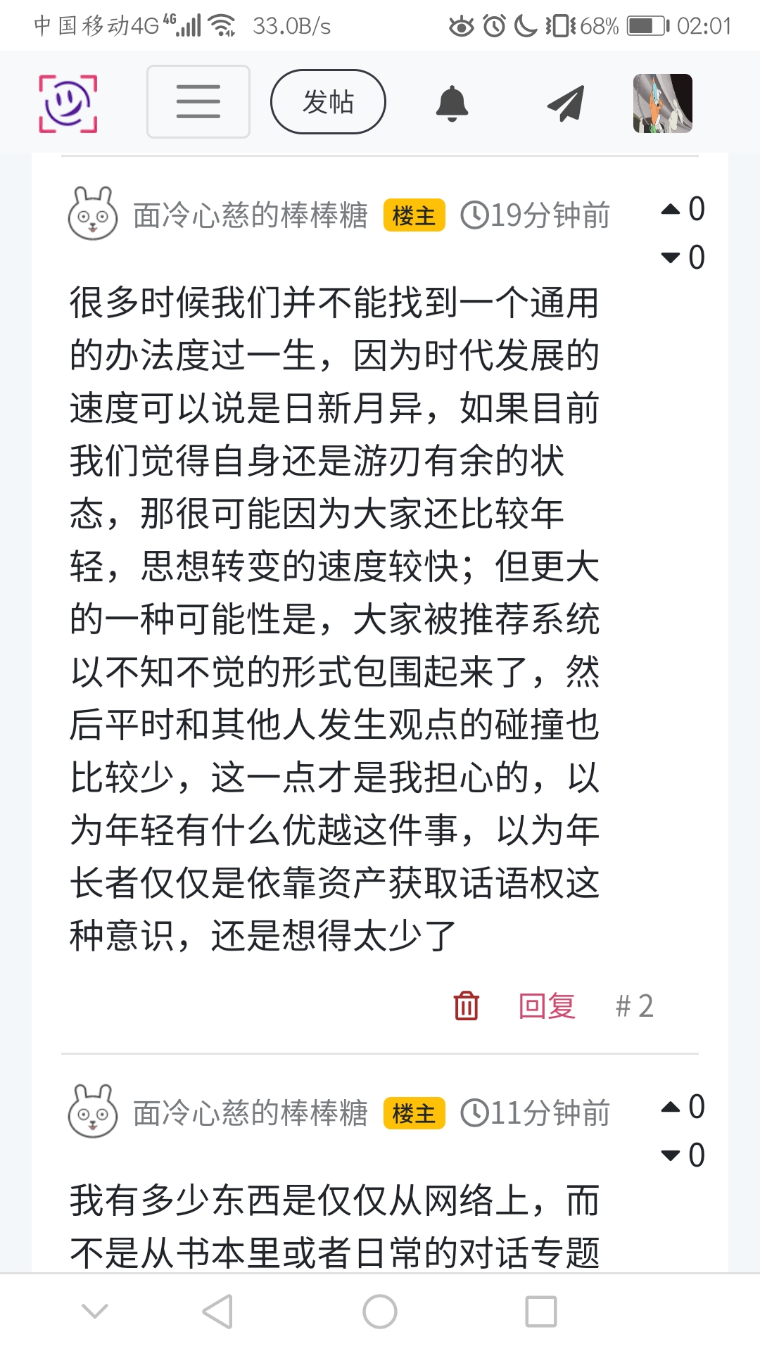 很多时候我们并不能找到一个通用的办法度过一生,因为时代发展的速度可以说是日新月异,如果目前我们觉得自身还是游刃有余的状态,那很可能因为大家还比较年轻,思想转变的速度较快;但更大的一种可能性是,大家被推荐系统以不知不觉的形式包围起来了,然后平时和其他人发生观点的碰撞也比较少,这一点才是我担心的,以为年轻有什么优越这件事,以为年长者仅仅是依靠资产获取话语权这种意识,还是想得太少了