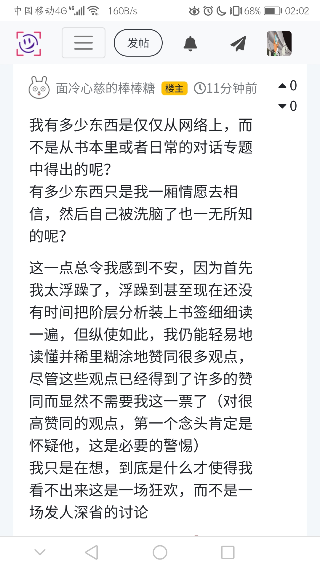 这一点总令我感到不安,因为首先我太浮躁了,浮躁到甚至现在还没有时间把阶层分析装上书签细细读一遍,但纵使如此,我仍能轻易地读懂并稀里糊涂地赞同很多观点,尽管这些观点已经得到了许多的赞同而显然不需要我这一票了(对很高赞同的观点,第一个念头肯定是怀疑他,这是必要的警惕)