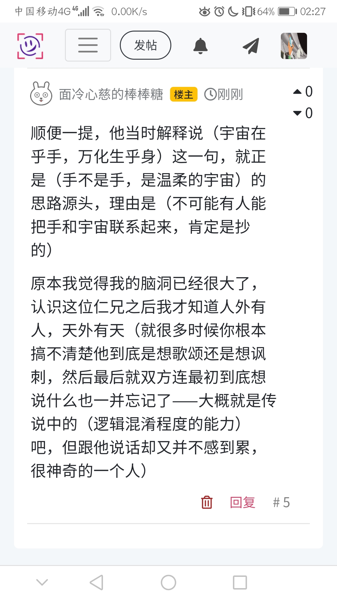 顺便一提,他当时解释说(宇宙在乎手,万化生乎身)这一句,就正是(手不是手,是温柔的宇宙)的思路源头,理由是(不可能有人能把手和宇宙联系起来,肯定是抄的)
