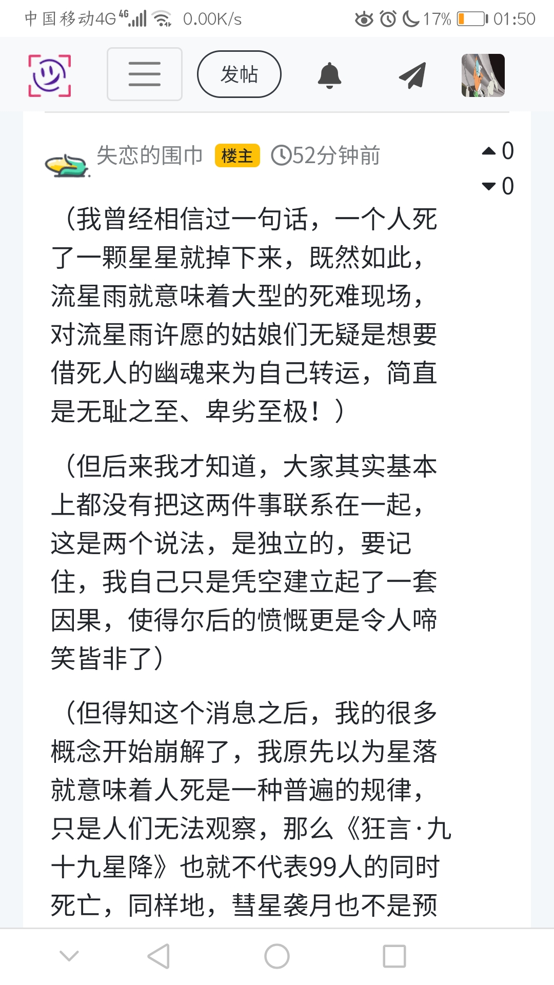 (我曾经相信过一句话,一个人死了一颗星星就掉下来,既然如此,流星雨就意味着大型的死难现场,对流星雨许愿的姑娘们无疑是想要借死人的幽魂来为自己转运,简直是无耻之至、卑劣至极!)
