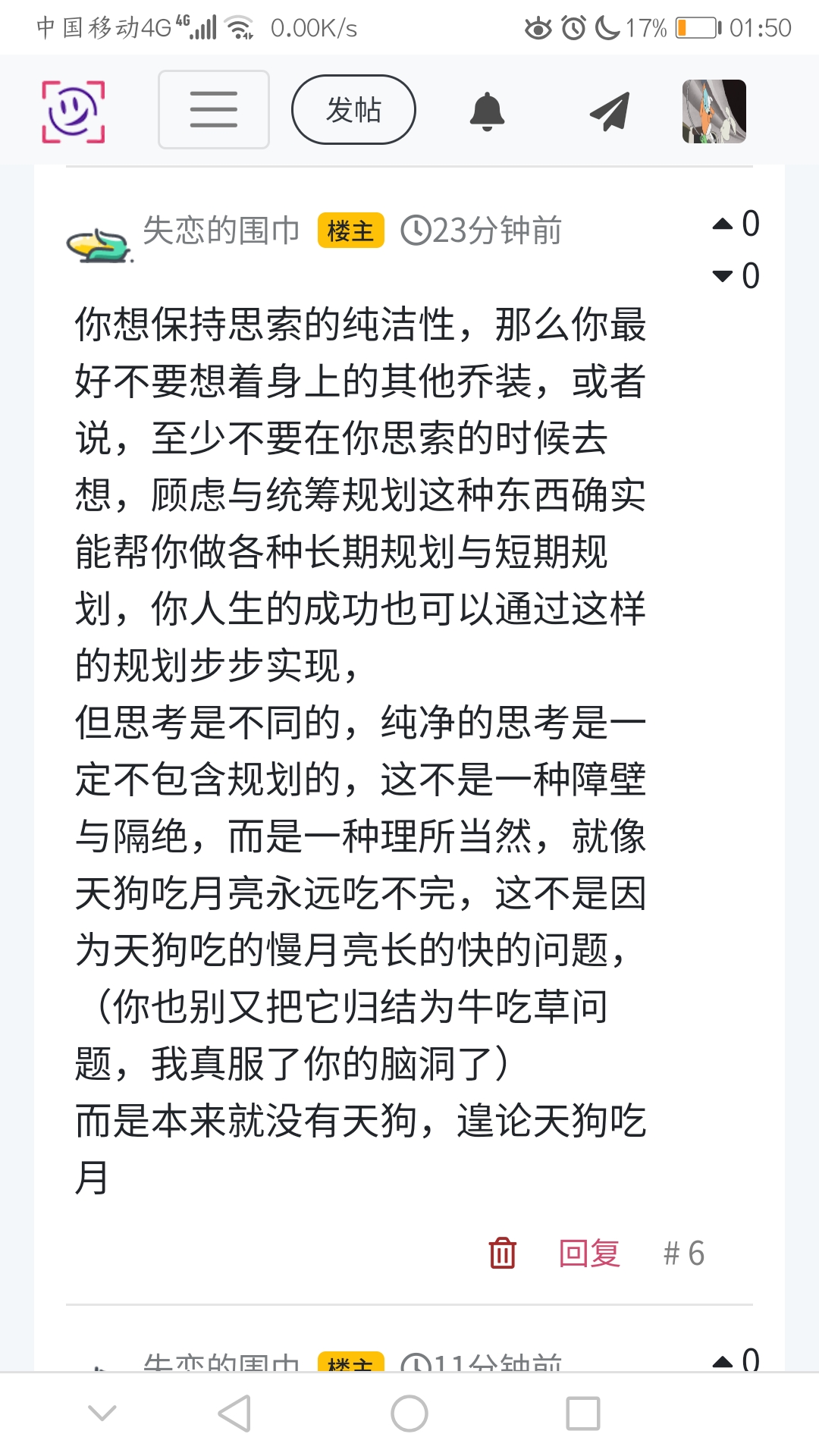 但思考是不同的,纯净的思考是一定不包含规划的,这不是一种障壁与隔绝,而是一种理所当然,就像天狗吃月亮永远吃不完,这不是因为天狗吃的慢月亮长的快的问题,