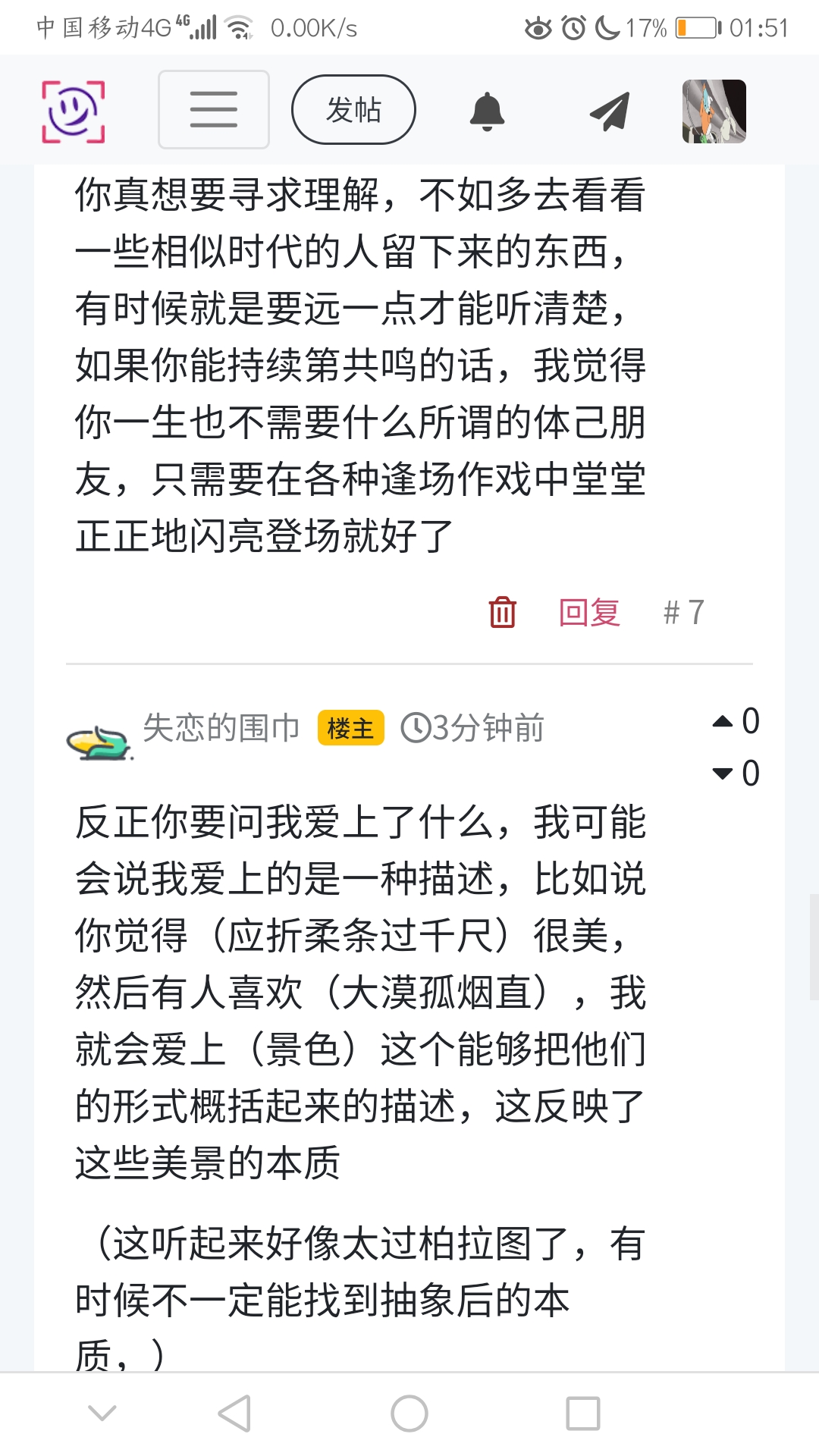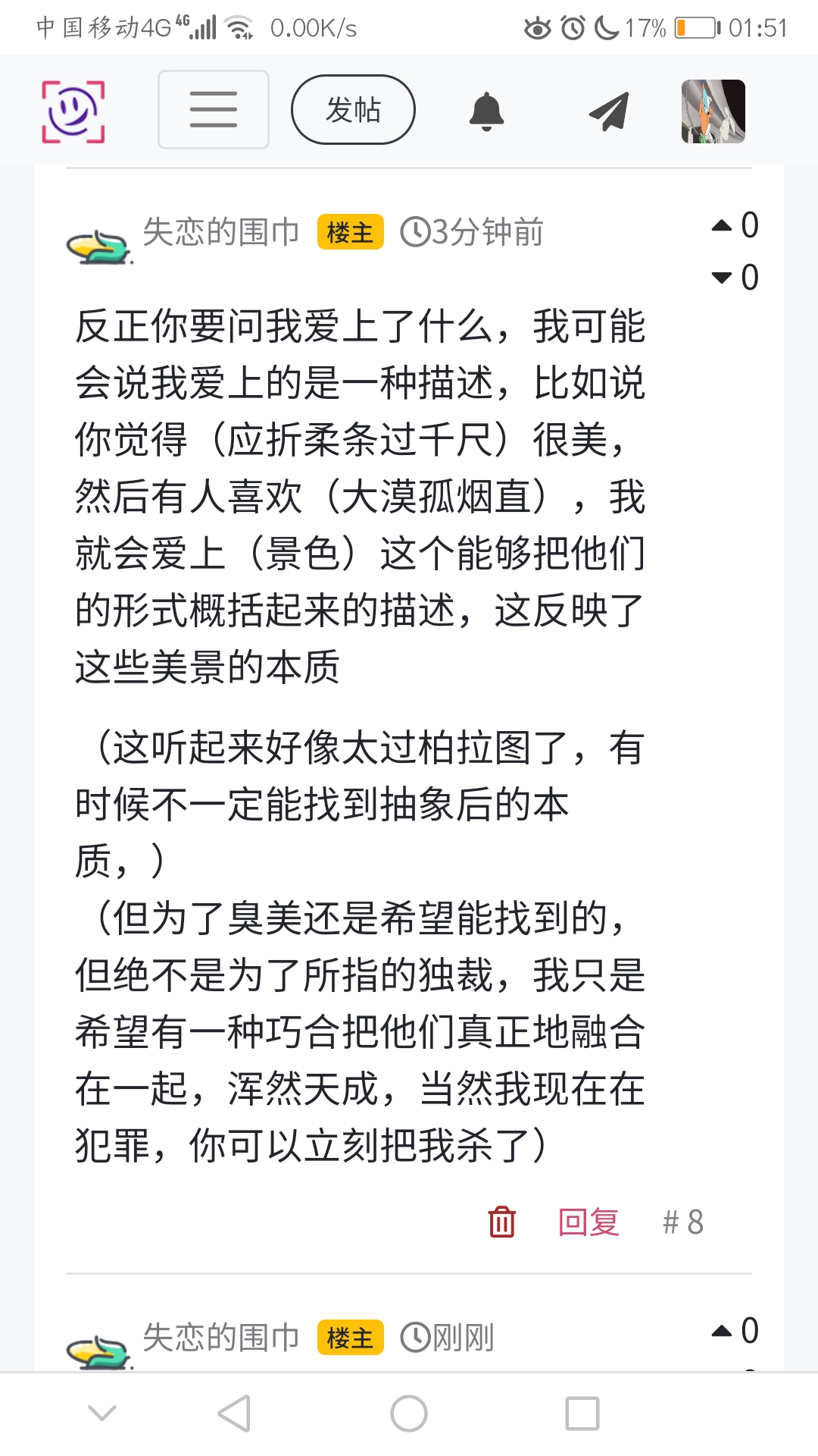 反正你要问我爱上了什么,我可能会说我爱上的是一种描述,比如说你觉得(应折柔条过千尺)很美,然后有人喜欢(大漠孤烟直),我就会爱上(景色)这个能够把他们的形式概括起来的描述,这反映了这些美景的本质
