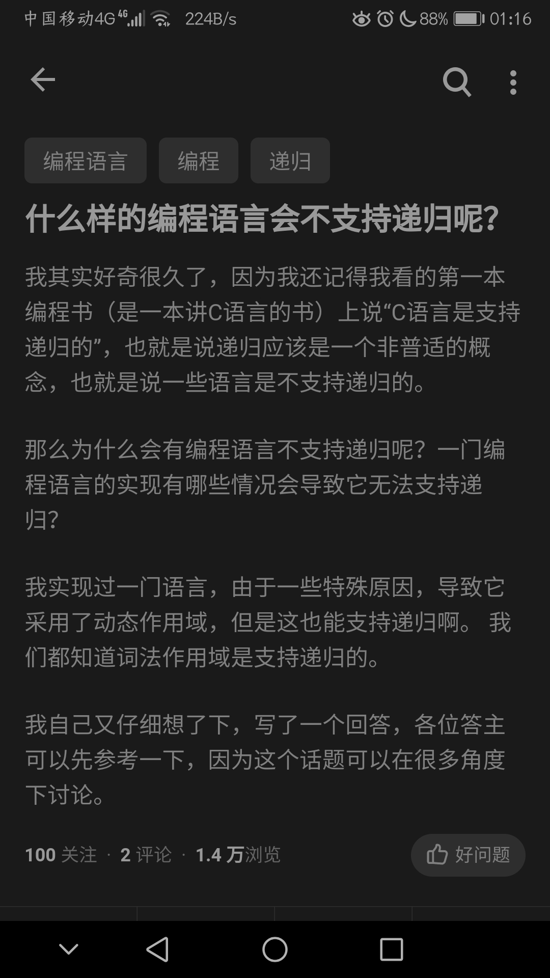 他通过(C语言是支持递归的),得出了(递归是一个非普适的概念)