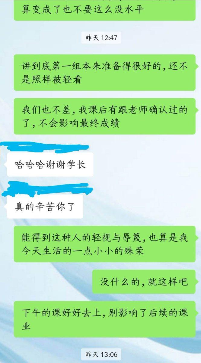 他们才大一大二,根本没见过世界上像你这么垃圾的人,明白吗,同时,我很清楚这种话拯救不了一些影响严重的同学,不管是不是我们小组的,明白吗。